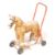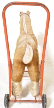 A vintage retro 20th century plush push along and ride on horse with applied label for International Model Aircraft Ltd to the underside of the horse and Tri-Ang wheelbase.