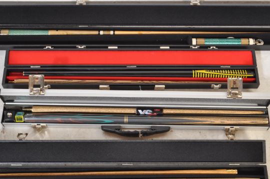 A collection of five contemporary snooker cues comprising of a Jimmy White Pool Master signature series BCE custom Blackhawk two piece snooker cue. Comes with own hardcover case, A Jimmy White Heritage collection BCE series snooker cue. comes in a metal case. A Ronnie O Sullivan Supa Pro / Supa Grip snooker cue. Comes with a soft cover carry case. Together with another four piece extendable cue.