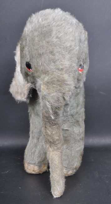 A vintage 20th century circa 1950s Merrythought Elephant. Having grey fur and button eyes. Makers label to the underneath. Measures: 30cm tall.