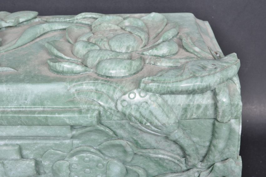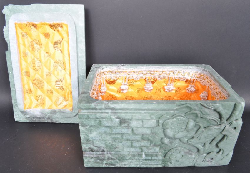 A large 20th century Chinese oriental soap stone box / jewellery box. The large rectangular green marble / stone box having raised floral and butterfly motifs to the lid and orange fabric interior. Measures 20 x 33 x 21cm.