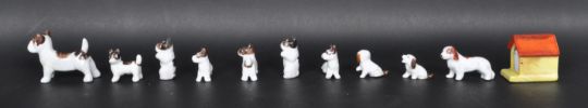 A collection of early 20th century circa 1920’s Japanese ceramic porcelain figurines. The collection include a sausage dog with Poppy’s and dog house together with a Westie dog with poppy. All complete with original box.