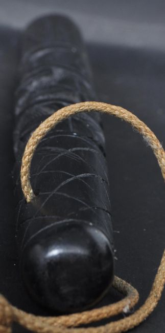 A 20th century Irish ebony wood truncheon carved with relief decoration of clovers of tapering form. Set with string handle. Measures 30cm.