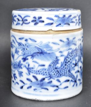 A 19th century century Chinese blue and white lidded pot / vase of cylindrical form having stylised decoration of flowers and dragons. Measures 7cm x 6cm.