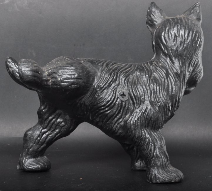 A vintage style cast metal door stop in the form of a Scottish Terrier cocking its leg having textured detailing throughout. Measures 17cm x 20cm.