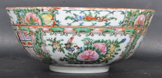 An early 20th century Chinese Canton famille verte bowl having polychrome floral detailing. Stamp to the underside. Measures 20cm. Signs of wear commensurate with its age.