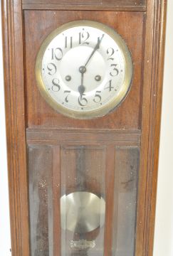 An early 20th century circa 1920s 8 day oak cased wall clock having a carved shell motif to the top,  Arabic numerals to the chapter ring, bevel edge glass to the front. Comes with pendulum and key. Measures approx. 71cm x 32cm x 15cm.