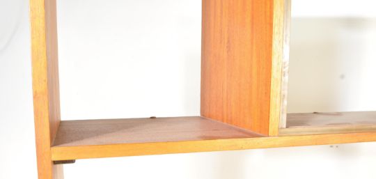 A mid 20th Century retro vintage teak Portwood room divider / wall unit bookcase. The upright teak wood cabinet gaving glazed sliding doors with an arrangement of shelves and a writing area to the right. Measures approx. Measures