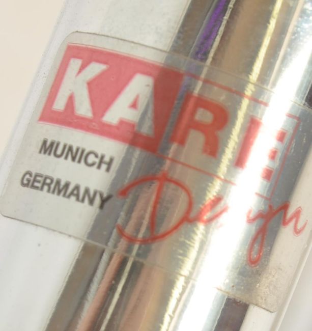 A Kare Design modern side table having a circular tempered glass platform with a chrome L shaped support. Makers stamp to the glass