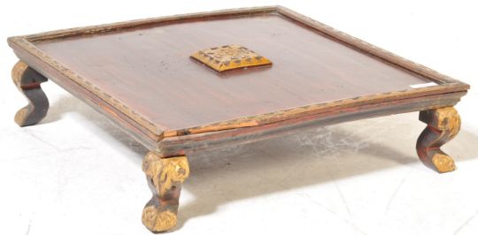 A 19th century Indian hardwood tray / gaming table having raised central carved motif, carved edges raised on shaped feet. Measures approx. 13cm x 46cm x 45cm.
