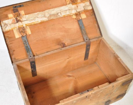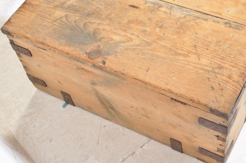 An early 20th century pine workmans tool chest box having iron strapwork to the corners, hinged lid opening to reveal a spacious interior. Measures approx. 35cm x 77cm x 44cm.