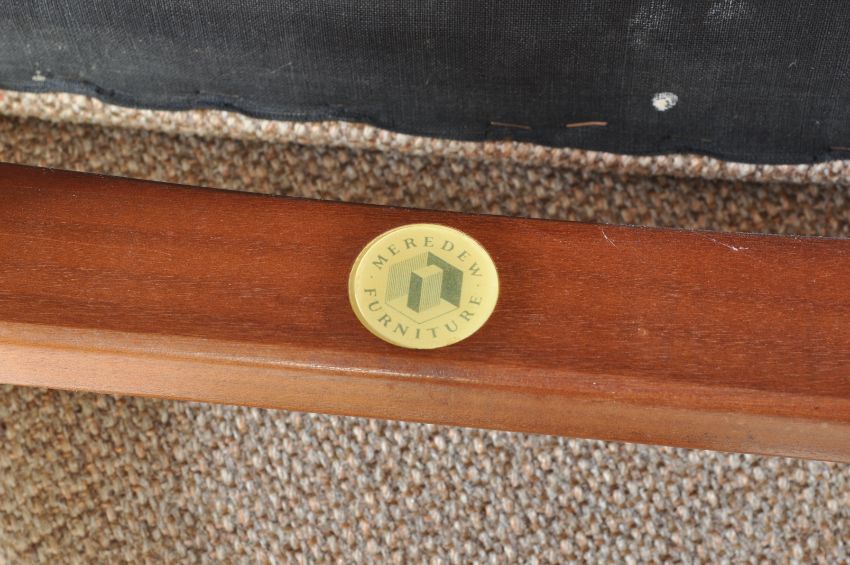 A pair of vintage retro mid 20th century teak wood frame dining chairs by Meredew. The chairs having curved lather backrest with padded seats raised on shaped legs. Measures 78 x 48 x 48cm.