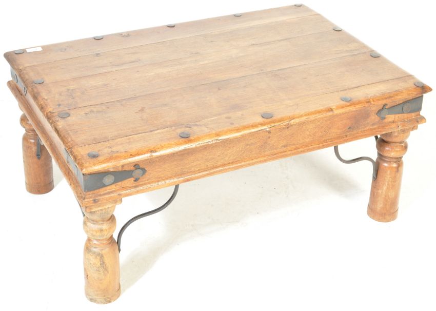 A vintage style Mango wood coffee table / occasional table. The table of a rectangular form raised on turned supports decorated with iron bands. Measures, 42 cm H x 91 cm W x 62 cm D