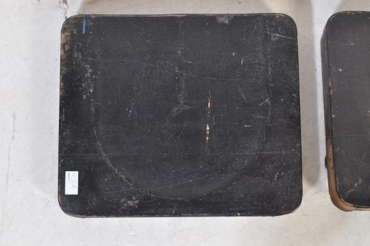 Of Local Bristol Interest - A pair of early 20th century seats from Eastville Stadium, constructed in 1897 and demolished in 1998 and home of Bristol Rovers F.C. The saddle seats being painted back and blue with seat numbers 31 & 30 stencilled in white with cast iron bench ends. Measures 41cm x 35cm x 4cm.  Measures 76cm x 20cm x 4cm.