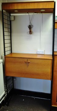 Robert Heal - Staples - Ladderax - An original retro vintage 20th Century four bay modular wall unit of great proportions comprising of five black metal uprights with a series of teak shelves, fall front sections with fitted interiors and glass fronted display case. Two top sections with fitted spotlights. Makers marks present. Wear commensurate with age, overall a good example. Measures approx; 203cm x 376cm x 36cm.