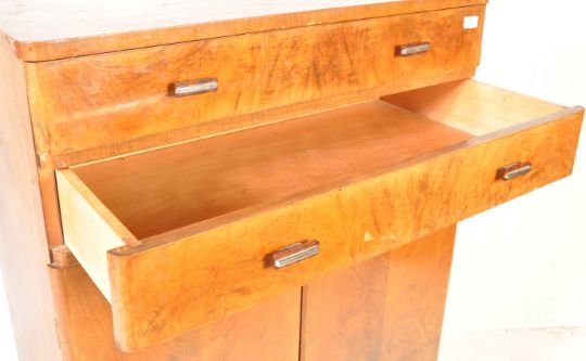 An early 20th century circa 1930’s Art Deco walnut tallboy. The pedestal tallboy having two drawers atop over twin doors cupboard raised on block feet. Measures: 138cm H  x 52cm D x 84cm W