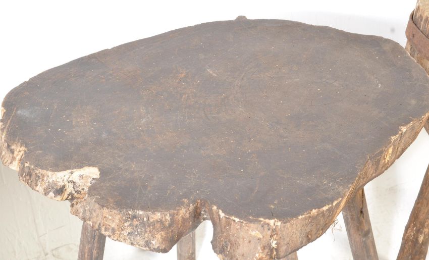 A collection of rustic 20th century reclaimed wood furniture to include a table of circular form with iron coopering raised on three legs, together with three other items.