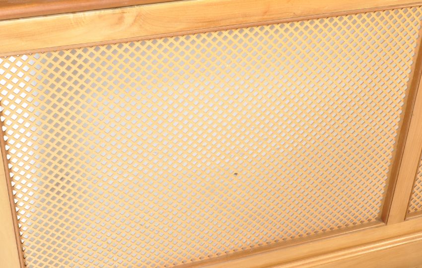 A vintage 20th century walnut / solid walnut hand made bespoke by previous owners of country house library bookcase cabinet having a flared cornice atop an openfaced set of shelved atop a lattice radiator cover. Measures approx. 224cm x 121cm x 48cm