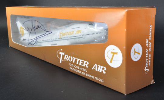 Only Fools & Horses - 40th Anniversary Auction - a scarce 1/250 Scale Model ' Trotter Air Boeing 747 ' diecast model aeroplane. The model based on a joke in the 1996 Christmas Special 'Heroes & Villains'. Signed on the front in black ink by Sir David Jason. Brand new. Supplied with a COA from the Only Fools and Horses Appreciation Society.