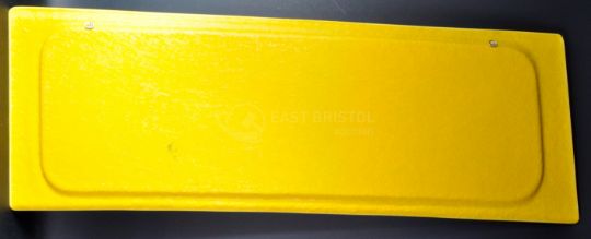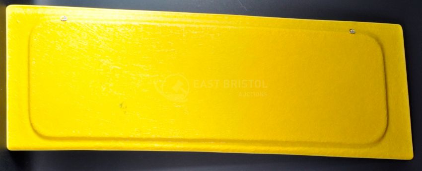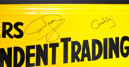 Only Fools & Horses - 40th Anniversary Auction - a lifesize 1/1 scale replica side panel from Reliant Regal Supervan III ' Trotter Van ', in full Trotters Independent Traders livery, signed by Sir David Jason (Del) in black ink, adding the famous catchphrase ' Cushty '. Yellow, with livery in black, with a deliberately dirty paint scheme. Mounting points to rear for easy wall-mounting. Supplied with a COA from the Only Fools & Horses Appreciation Society. Measures approx 114cm long.