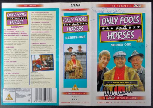 Only Fools & Horses - 40th Anniversary Auction - Series 1 - a scarce triple-signed Series One VHS cover, signed by: Sir David Jason, Roger Lloyd Pack (1944-2014) and John Challis (1942-2021). Signed in blue and black ink respectively. With certificate.