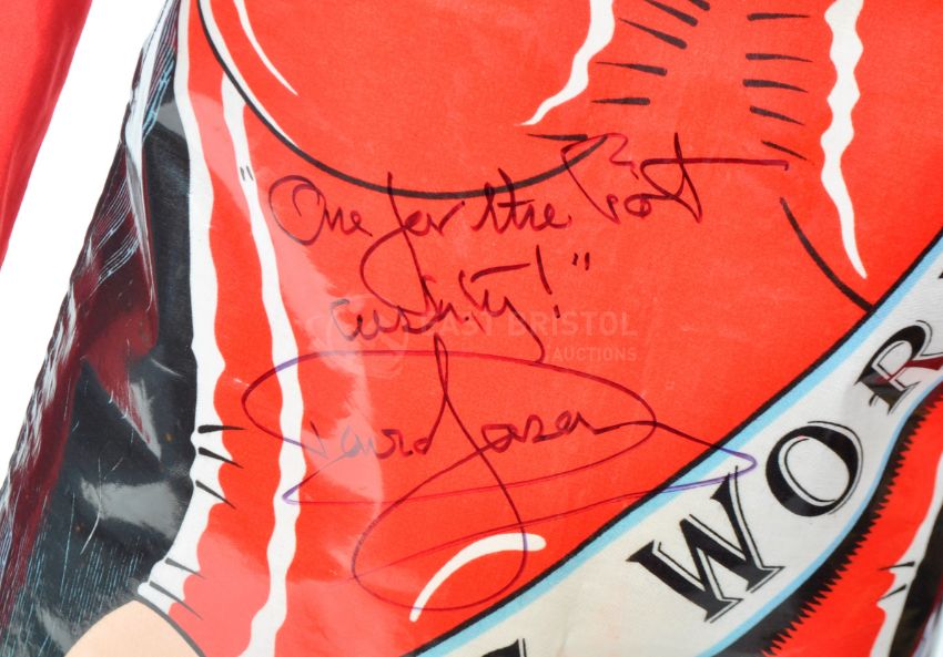 Only Fools & Horses - 40th Anniversary Auction - Strangers On The Shore (2002 Christmas Special) - ' Chicken Trotter ' replica costume display, comprising of a ' Miss Universe ' apron identical to that worn by Del in the episode, signed to the front by Sir David Jason in black ink, adding the line 'One For The Pot - Cushty! '. The display also featuring a red jumper, gold plated ' D ' necklace and a flat cap. Complete with mannequin, and standing on an original section of screen used carpet from the Trotter's flat, as used in the 2001-2003 Christmas Specials. With COAs from the Only Fools & Horses Appreciation Society for both the carpet, and apron.