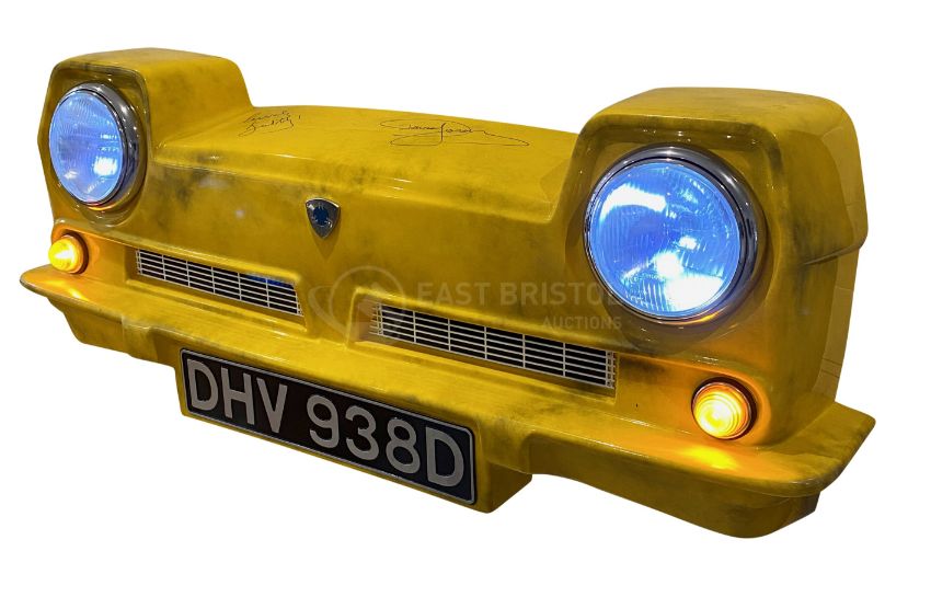Only Fools & Horses - 40th Anniversary Auction - a lifesize front nose cone of a Reliant Regal Supervan III ' Trotter Van '. Fibreglass construction, identical in every detail, complete with a deliberately dirty paint scheme, Reliant badge and real working headlights. Custom made, and fitted with remote control electronic lights and sounds. It plays both opening and closing theme tunes in full, as well several other one-liners from the show (and a few extras) - a total of 27 different sounds. The nose cone comes signed by Sir David Jason (Del) in black ink, with the iconic catchphrase ' Lovely Jubbly! '. Jason has only ever signed a handful of these, and they exist in extremely limited numbers. Wall mountable. Dimensions: 140cm wide X 50cm high X 30cm deep (approximately). Supplied with a COA from the Only Fools and Horses Appreciation Society. A unique piece of Only Fools memorabilia.