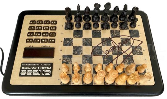 Only Fools & Horses - 40th Anniversary Auction - Big Brother (Series 1) - an original vintage c1970s ' Chess Challenger Voice ' made electronic talking chess game, identical to the one seen being played by Grandad in the very first episode, Big Brother. The chess board comes signed to the top by Sir David Jason in black ink. The set itself complete with all pieces, and housed in its original case. Hard to find item from the classic sitcom. Supplied with a COA from the Only Fools and Horses Appreciation Society. “It’s a talking chess game. You can’t play draughts on a talking chess game!”