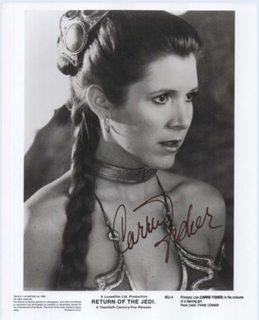 Star Wars - Carrie Fisher (1956-2016 - Princess Leia) - autographed 8x10" black and white photograph from Return Of The Jedi, signed by Fisher in black ink to a light central area. Undedicated. Supplied with a certificate from an AFTAL registered dealer.