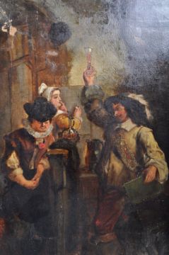 A 17th Century oil on canvas Dutch painting depicting a Flemish scene with gent raising an ale glass for a toast with another figure seated on the left and maiden behind. The interior scene busy with various period objects. Unframed. Some wear to top section. Measures approx; 33cm x 21cm.