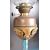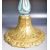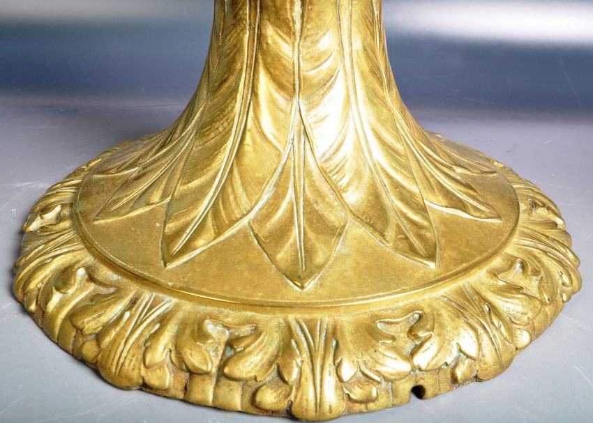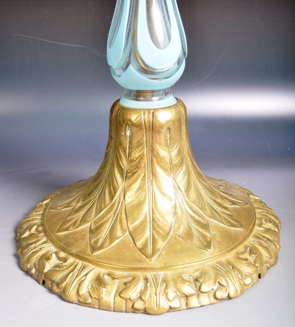 A 19th Century Victorian Art Nouveau oil lamp stand having a classical ormolu bronze oil lamp holder with cherub face masks and pierced leaf decoration. The central clear glass fluted column having cut back turquoise blue glass and all raised on a large bronze acanthus leaf pedestal circular base. Complete with a Lampe Veritas oil burner with frosted shade and flume. Measures approx; 87cm tall.