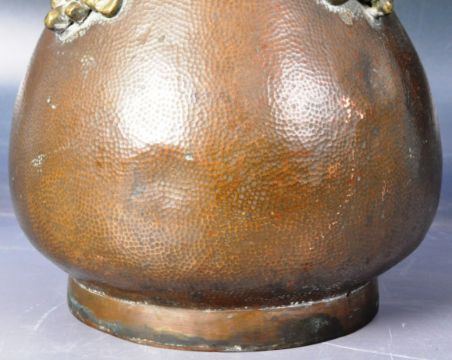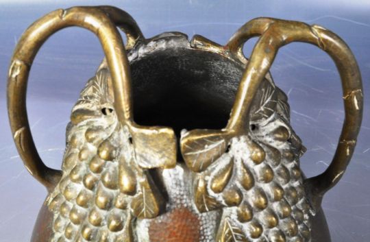 An early 20th Century Chinese Republic period bronze vase of ovoid shape having shaped naturalistic grape & vine mounts and handles. Stamped China and numbered to base. Measures approx; 21cm tall.