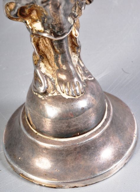 An early 20th Century Silver plated celebration car mascot in the form of a winged female holding a leaf in one hand and a torch in the other dressed in classical garments. Stood upon one leg raised on a domed base. Wear commensurate with age mostly to the silver plate and damage to the torch. Measures approx; 18cm x 11cm.