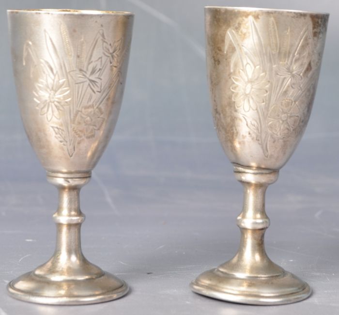 A pair of early 20th Century Russian silver vodka drinking cups / drinks measures. The cups in the form of miniature goblets with engraved floral decoration to the bowls and raised on knopped circular pedestal bases. Silver marks present and stamped 830. Measures approx; 7.5cm tall. Weighs approx 63.5g.