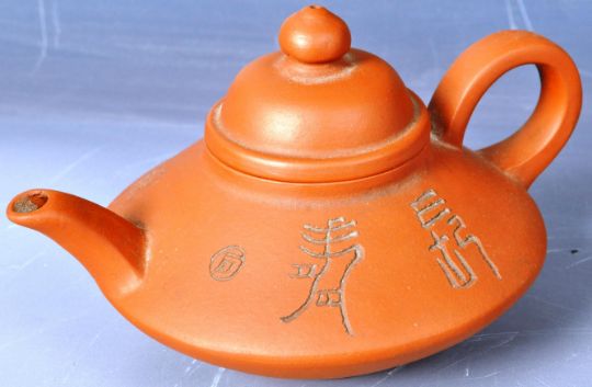 A 20th Century Chinese Yixing clay pottery teapot / writing water pourer having a bell shaped finial lid with shaped loop handle and small pouring spout. Incised decoration to rim, seal mark to underside and handle. No visible signs of major damage. Measures approx; 15cm long.