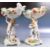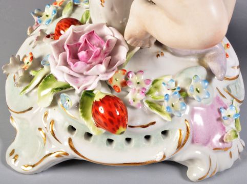 A matching pair of early 20th Century German Schierholz & Sohn (Plaue) porcelain figural centrepieces. Each having a shell top with floral and fruit accents supported by winged cherubs with painted features. Each raised upon pierced scrolled bases with further floral and fruit detailing. Each makers mark to the base. Wear commensurate with age mostly to the gilt paint with one having a sign of an early repair where the head meets the the shell. Each measures approx; 34cm x 19cm x 26cm.