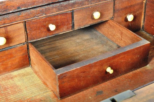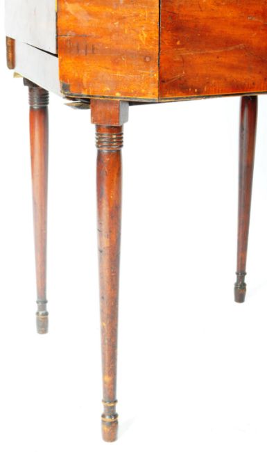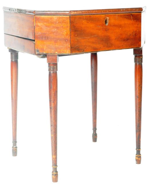 An 18th Century George III mahogany rent table of octagonal form having a half hinged top opening to reveal a fully appointed interior with a series of drawers with each having ivory handles. Two hidden drawers below with all being raised and supported on turned legs. Wear commensurate with age over all good. Measures approx; 65cm x 52cm x 44cm.