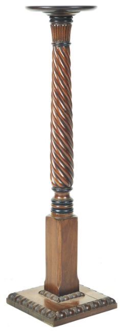 A 19th Century mahogany pedestal column jardiniere / bust stand having a square stand top with central gadrooned and barley twist column over block and carved edge square base. Measures approx; 113cm x 26cm.