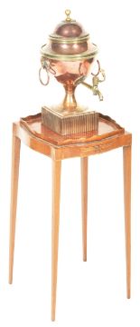 An 18th Century George III copper tea urn samovar on original mahogany stand. The copper urn with finial lid and interior lead weight, ring handles and pedestal base. The stand with serpentine edge and gallery top raised on tapering square legs and pull out cup / tankard rest slide. Measures approx; 96cm tall.