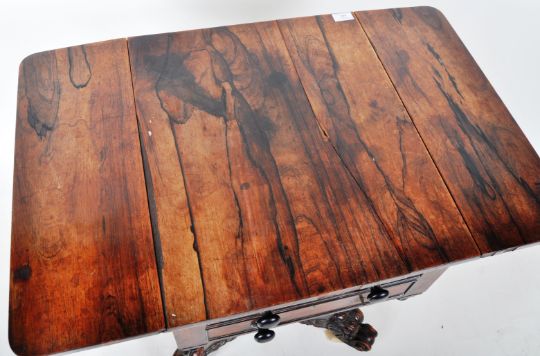A 19th Century William IV rosewood pedestal sofa table / work table in the manner of Gillows of Lancaster having a two drawer twin drop leaf top with turned ebony handles and ebony flash details raised on a large carved quadruped scroll leg pedestal base with repeat carved gadroon beading. Measures approx; 73cm x 43cm x 52cm.