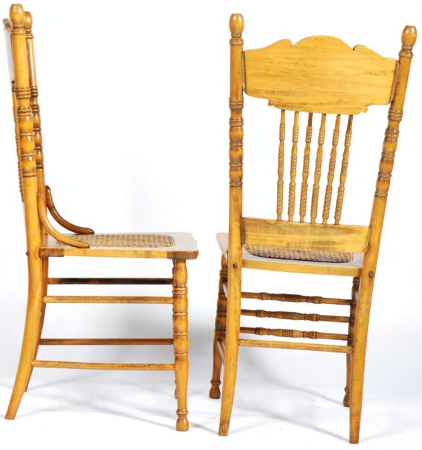 A set of twelve early 20th Century American Larkin Pressback dining chairs / side chairs in beech having finial tops with pressed backs decorated with scrolls and leaves, turned spindle back and woven cane seat. All raised on turned legs with spindle stretchers. Measures approx; 104cm x 39cm x 42cm.