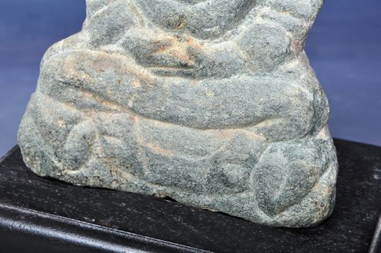 A 19th Century Chinese stone carved figurine of Buddha. The figure modelled seated with legs crossed in the Lotus position with feintly carved features. Set to an ebonised wooden stand. Measures approx; 24cm tall.