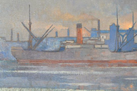 Owen Blair Reynolds - A 20th Century oil on canvas painting depicting an industrial dock yard scene with large ship facing left and busy industrial steel plants emitting clouds of smoke. Signed OB Reynolds to lower left corner. Measures approx; 52cm x 78cm.
