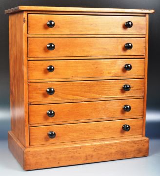 A 19th Century Victorian oak & pine specimen chest / collectors cabinet. The bank of six straight drawers having glass top liners / covers, an overhanging top edge with pairs of ebonised turned pull handles. All raised on plinth base. Measures approx; 42cm x 38cm x 32cm.