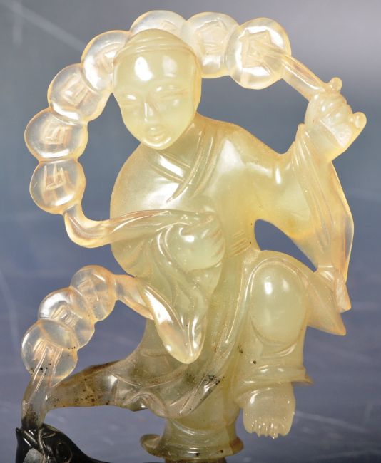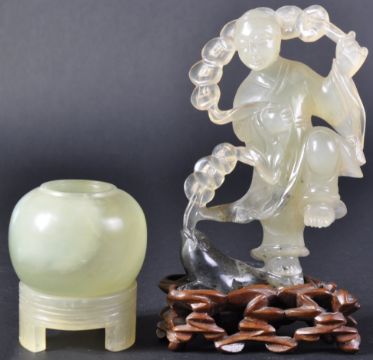 Two pieces of Chinese Oriental hand carved Bowenite / jade hardstone comprising a figurine group depicting a boy and toad likely Jin Chan. The figure central and dancing with coins being emitted from the frog / toads mouth. The figure graduating in color from clear / white, green and darker toward the toad. Set to a carved wooden base that is stamped '2' to the underside. Figure (AF) Measures without stand approx; 11cm tall. Along with an 19th Century Chinese Oriental hand carved Bowenite hardstone inkwell / ink pot or brush washer on stand in the form of a ginger jar. The vase of compressed squat form with plain sides, short circular rim and stepped base. Celadon green colour. The stand of archaic tripod form with carved grooves and Greek Key detailing to the legs / feet. Measures without stand 4cm x 5cm. Stand measures approx 2cm x 4.5cm.