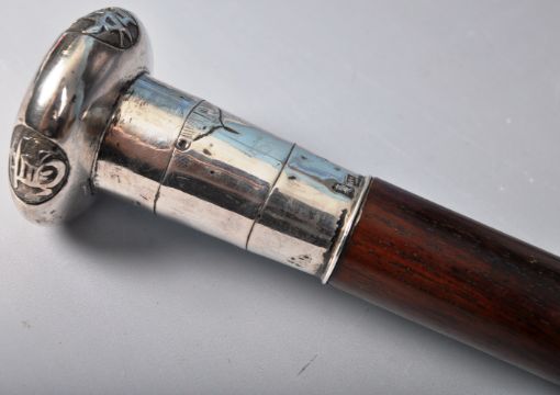 An early 20th Century Chinese silver topped walking stick cane having a knop top with impressed character marks round to the top with makers marks to the collar. Ebonised tapering shaft with brass ferrule. Measures approx; 91cm long.