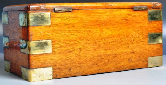 A 19th Century oak campaign box having a canted edge brass inset cartouche to lid with brass corner hinged and central circular lock escutcheon. Measures approx; 13cm x 28cm x 15cm.