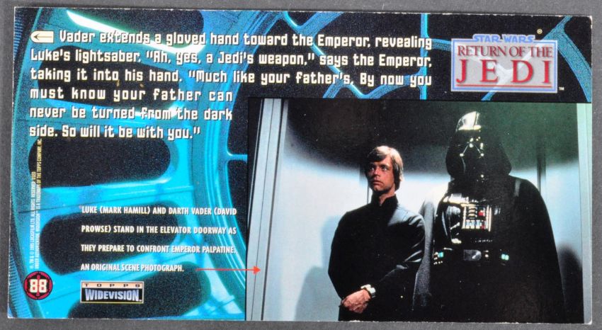 Star Wars - James Earl Jones (Voice of Darth Vader) - an autographed official Topps Widevision Return Of The Jedi trading card. Signed neatly in gold ink to a dark area of the image. Obtained personally by the vendor. 6.5cm x 12cm.