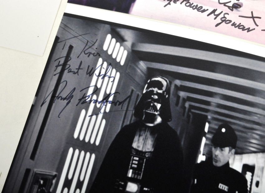 Star Wars - a collection of x11 signed 8x10" photographs from the franchise (both original trilogy and prequels), to include autographs from: Andy Bradford (Imperial Officer), Kaye Power McGowan (reputedly a Stormtrooper - x2), Mike Quinn (Nien Nunb), Caroline Blakiston (Mon Mothma - with note to reverse), Frank Henson (Stormtrooper), Tim Dry (J'Quille), John Forgeham (Captain Bolvan), Mike Havord (Colonel Jendon - x2) and others. All dedicated. Some officially licensed photographs present. All obtained personally by the vendor.
