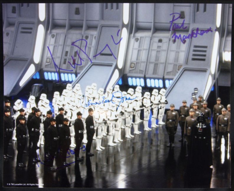 Star Wars - Return Of The Jedi - a unique multi-signed Imperial 8x10" officially licensed photograph, signed x4 original cast members - James Earl Jones (Voice of Darth Vader), Michael Pennington (Moff Jerjerrod), Paul Markham (Imperial Officer) and Ken Coombs (Imperial Officer). All signed in blue ink, undedicated. All obtained personally by the vendor from various personal appearances. Unique.