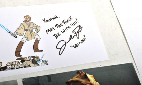 Star Wars - Clone Wars - a collection of x13 autographs from various voice actors associated with the animated series. Includes: James Arnold Taylor (Obi Wan - signed photograph, and hand signed copy of a sketch), Andre Sogliuzzo (Commander Cody - signed photograph and letter), Daran Norris (Durge - signed photo), Catherine Taber (Padme - x2 signed 8x10s & letter), Kevin Michael Richardson (Various voices - signed photo), John Childress Farmer (Crew - signed note), Sunil Malhotra (Jinx - signed 8x10" photo), George Takei (also know for Star Trek - signed undedicated 8x10") and Jeff Anderson (Smug - signed 8x10"). All obtained personally by the vendor.